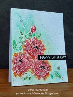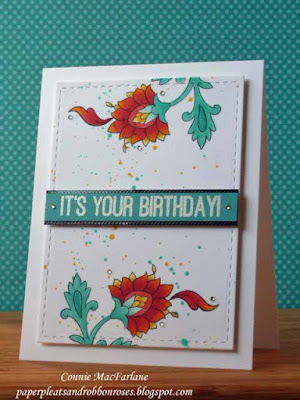 I stamped a panel with the stamp set Doodlie-Do and VersaMark ink, then heat embossed with clear. I sponged on three colours of Ranger distress ink and then die cut the panel with a Stitched Rectangle Die from Lil Inkers. The sentiment was stamped in Versafine Onyx Black ink and then heat embossed with clear. I popped the panel up with foam and left the card clean and simple and flat for mailing.